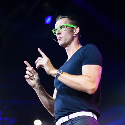 Seine energiegeladenen, interaktiven Keynotes bewegen das Publikum buchstäblich und im übertragenen Sinne zum Handeln. Die Teilnehmer tragen seine charakteristische grüne Brille als Erinnerung daran, sich auf die Zukunft zu konzentrieren, groß zu denken statt nur beschäftigt zu sein, und schaffen so ein unvergessliches Erlebnis, das Erkenntnisse mit Spaß verbindet.